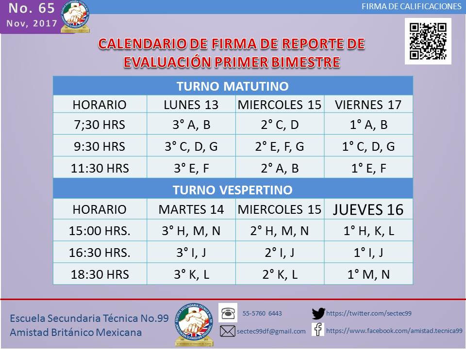 AVISO 65EST 99 ABM6 nov 20171 Min. de lecturaCALENDARIO DE FIRMA DE REPORTE DE CALIFICACIONES CORRESPONDIENTE AL PRIMER BIMESTRE.